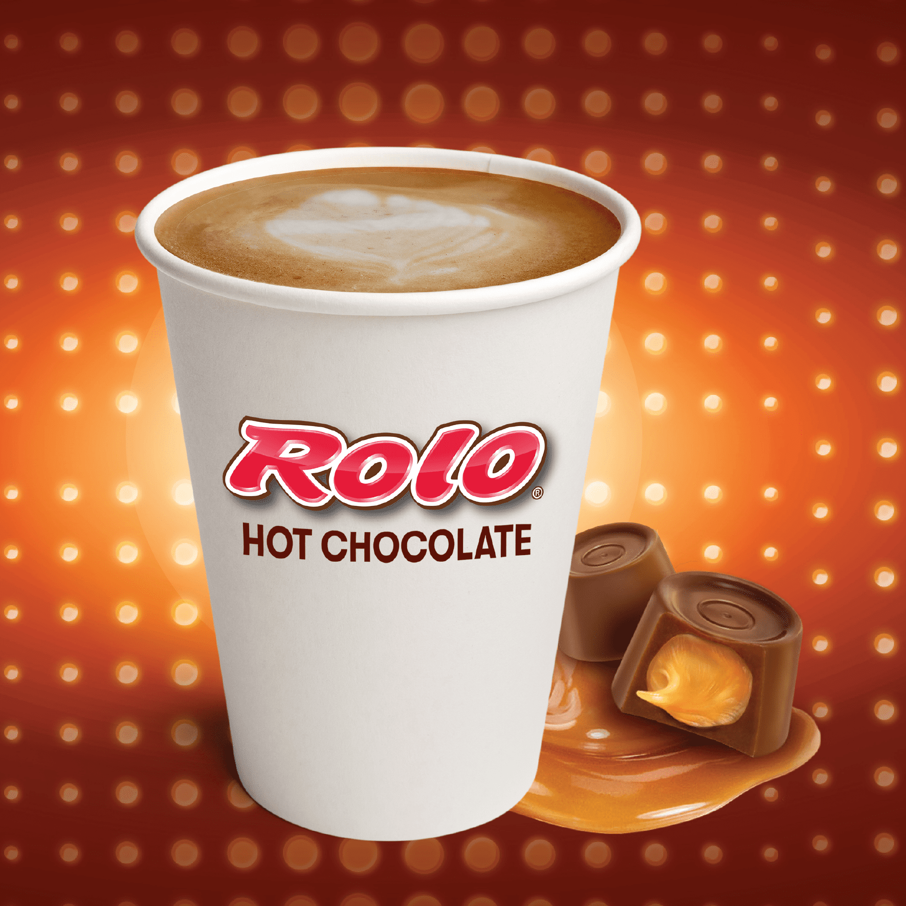 ROLO® Hot Chocolate combines smooth milk chocolate and slow melting caramel to create an indulgent and velvety taste. Grab a sweet treat without slowing your roll! ROLO® trademark and trade dress are used under license from Société des Produits Nestlé S.A. and with permission from The Hershey Company.